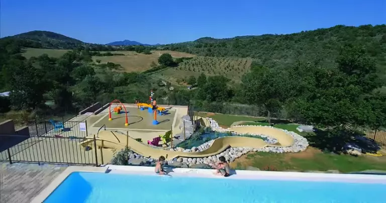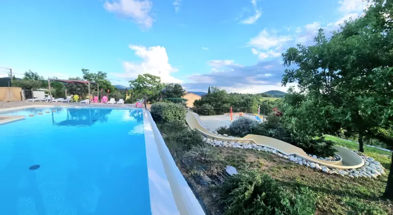 Grands emplacements en terrasse, beau panorama, piscine, toboggan aquatique, jeux aquatiques, aire de jeux, nouveaux sanitaires, snack bar, animation.