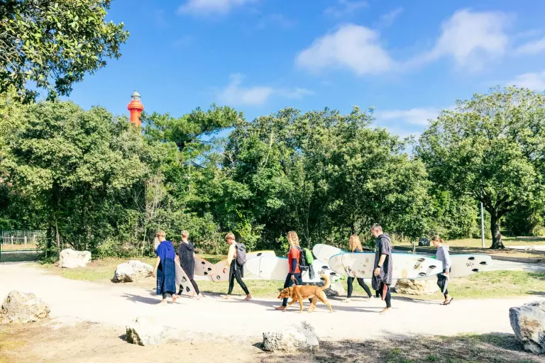 Gare de Royan à 17 km, puis navette de bus juillet et août en correspondance avec les trains venant de Paris, ou taxi jusqu'à La Palmyre.