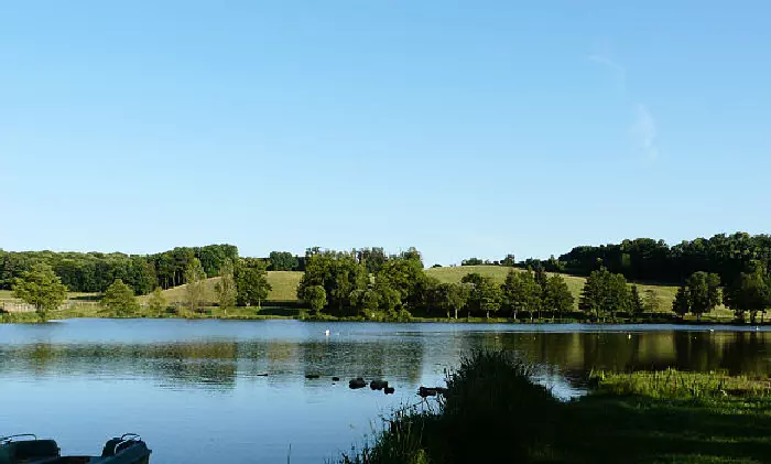 Le camping, très arboré, bénéficie d'une vue exceptionnelle sur les collines du pays Arédien et sur le plan d'eau.