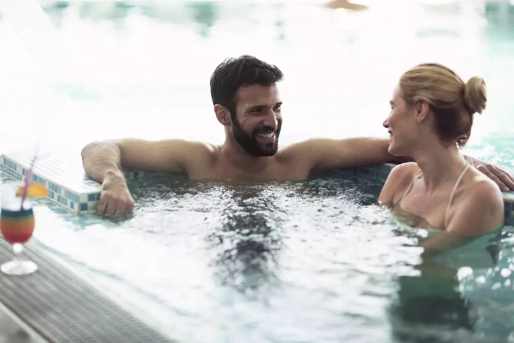 Pour votre détente et pour profiter des plaisirs de l'eau toute la saison, l'espace intérieur offre un joli bassin (12 m x 4 m) chauffé à 28°, agrémenté de banquettes de balnéothérapie, canons à eau et d'un espace détente avec sauna.