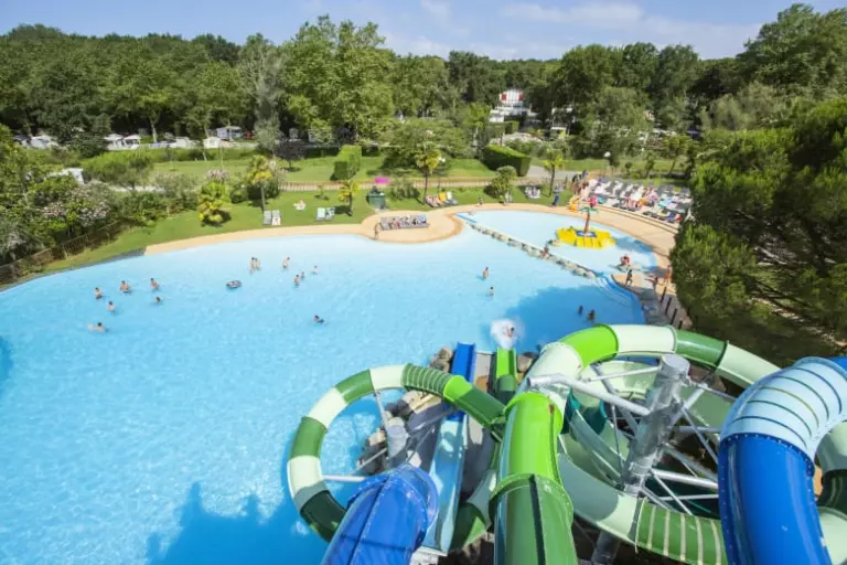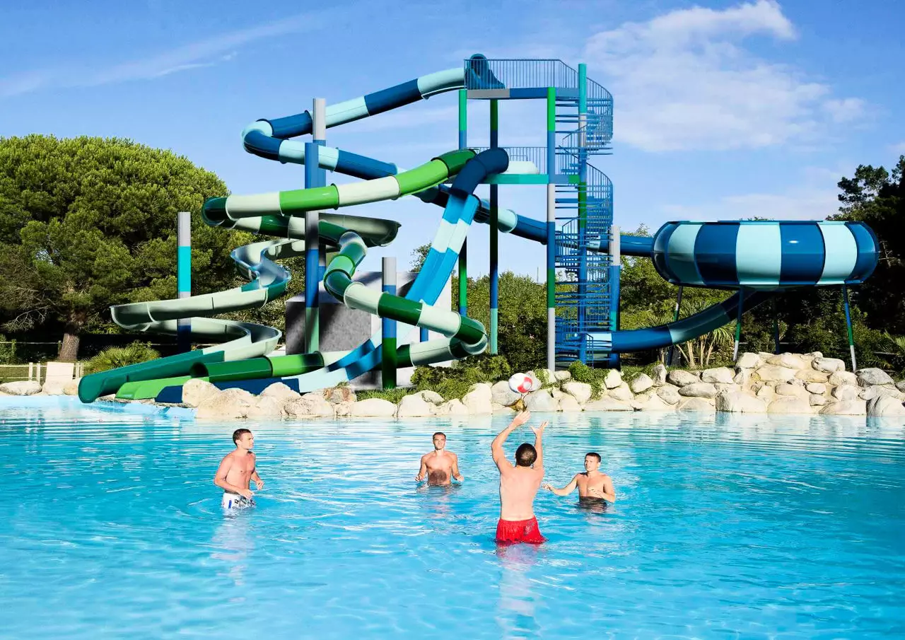 - Grand complexe aquatique extérieur avec piscine, pataugeoire et toboggans (secteur Sud) :