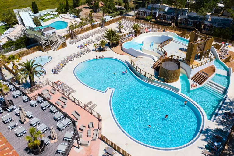 parc aquatique chauffé de 700m² avec piscines extérieures, bain à remous, pataugeoire, jeux d'eau et toboggans pour le plaisir des petits comme des grands.