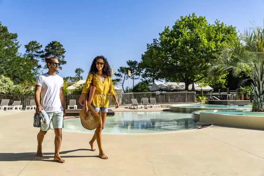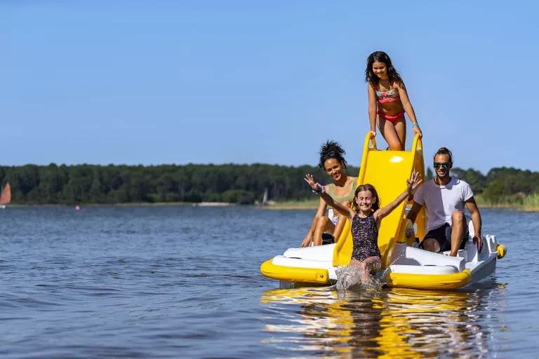 Au camping lac de Sanguinet, c'est baignade à volonté ! En plus un espace aquatique avec piscine chauffée et pataugeoire, petits et grands profitent de l'accès direct au lac de Sanguinet dont la température atteint les 28° en été. Ses eaux calmes et peu profondes sont parfaites pour la baignade en famille ! Et pour les fans de glisse, cap sur les longues plages de Biscarrosse à 20 min du camping !