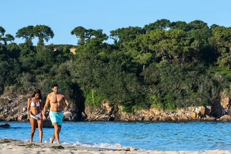 Si vous êtes plutôt mer, un sentier vous mènera directement à la petite plage Saint Nicolas : sable fin, eau turquoise, cabine en bois peint, un cadre idyllique de vacances !