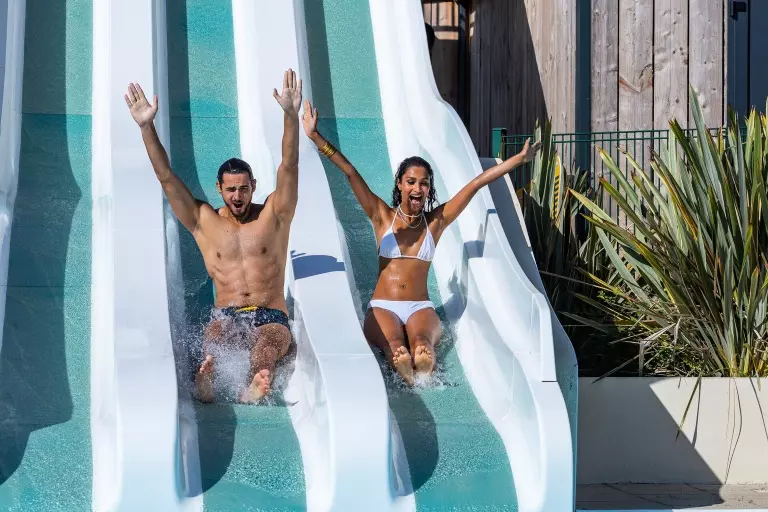 • Parc Aquatique : toboggans, pataugeoire, grande piscine extérieure, et piscine couverte chauffées à 28 degrés, espace balnéo avec douche cascade
