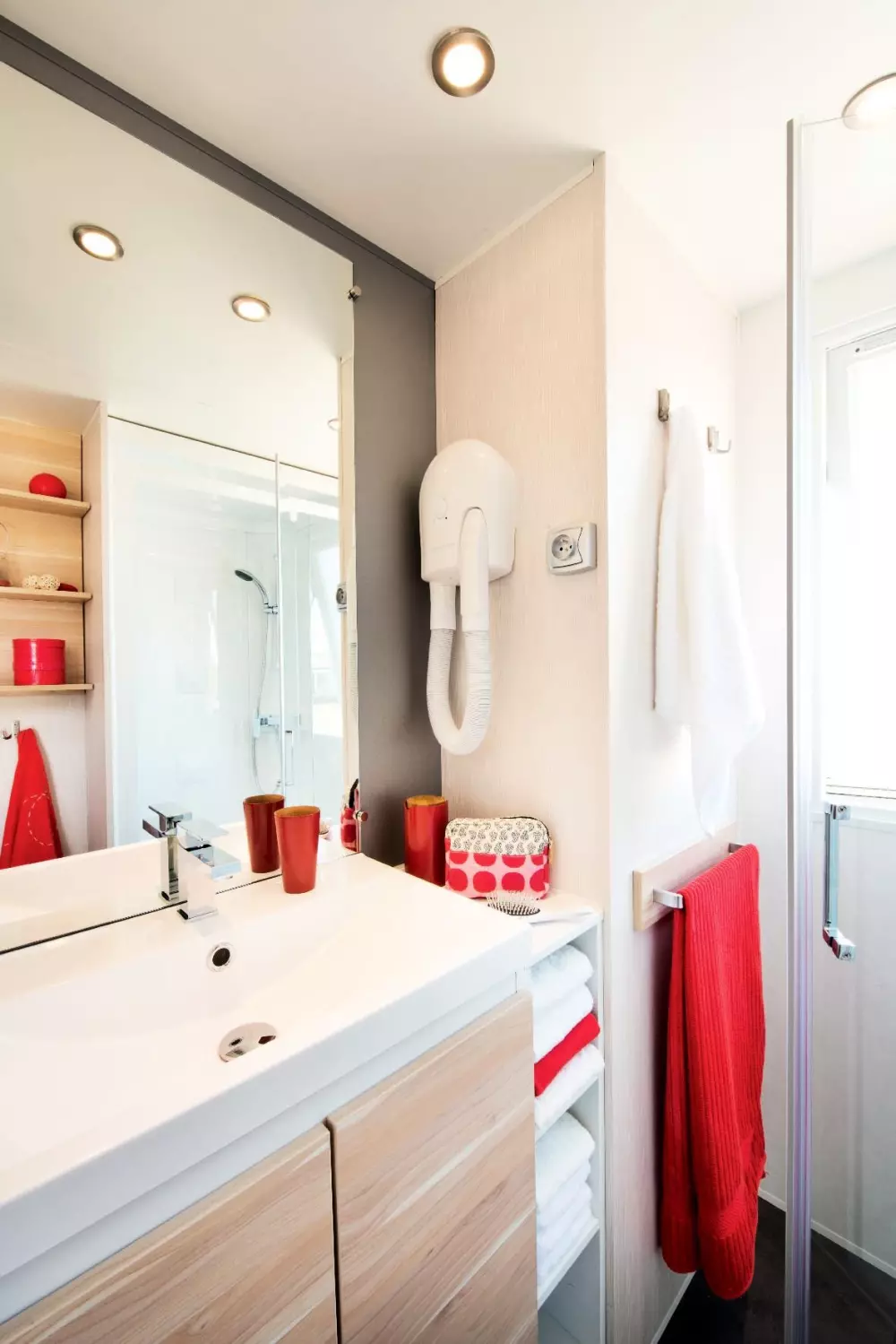 Sanitaires confortables avec eau chaude comprise dans le prix du séjour, baignoire pour bébé et sanitaire pour personne à mobilité réduite (douche et wc).