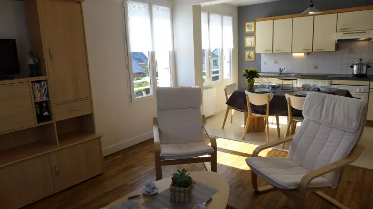 Appartement au 1er étage. Séjour. Coin-cuisine. Chambre 1 : 1 lit 140. CH 2 : 2 lits 90. 1 canapé convertible. Salle d'eau. Wc. TV. Lave-linge. Lave-vaisselle. Congélateur. Wi-fi. Draps et linge de maison non fournis. Chauffage électrique en supp. Stationnement d'un véhicule facilité par les propriétaires. En deuxième ligne de front de mer (plage classée "Pavillon Bleu"), vous bénéficiez à 50 mètres d'une école de voile (char à voile, catamaran...) et des plaisirs de la plage. Des couchers de soleil spectaculaires ponctuent d'agréables journées.