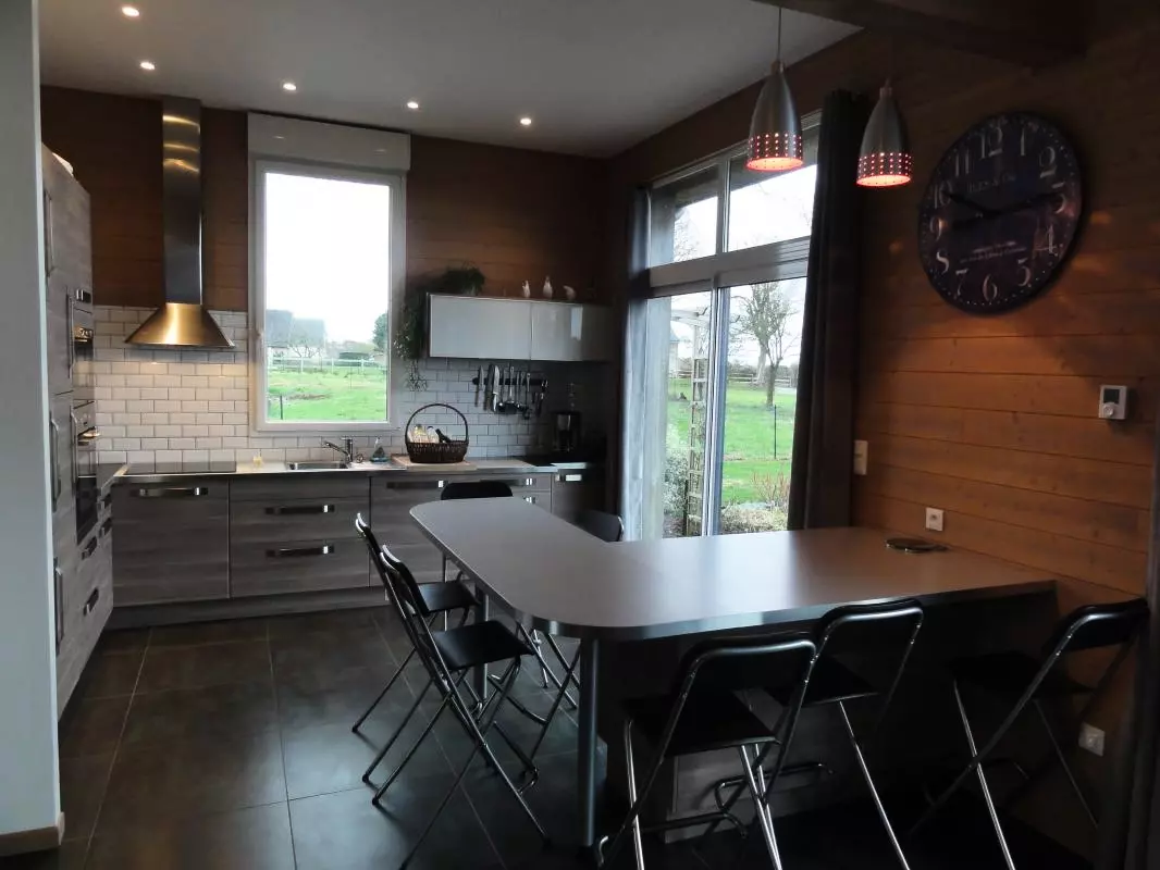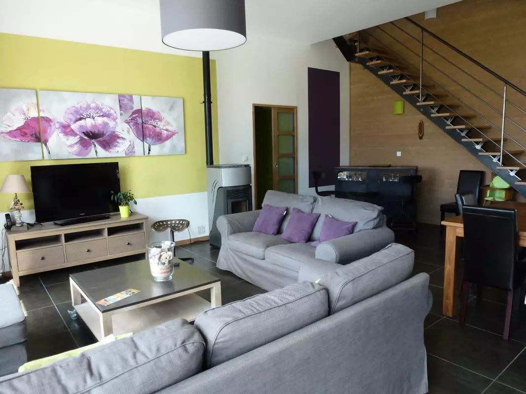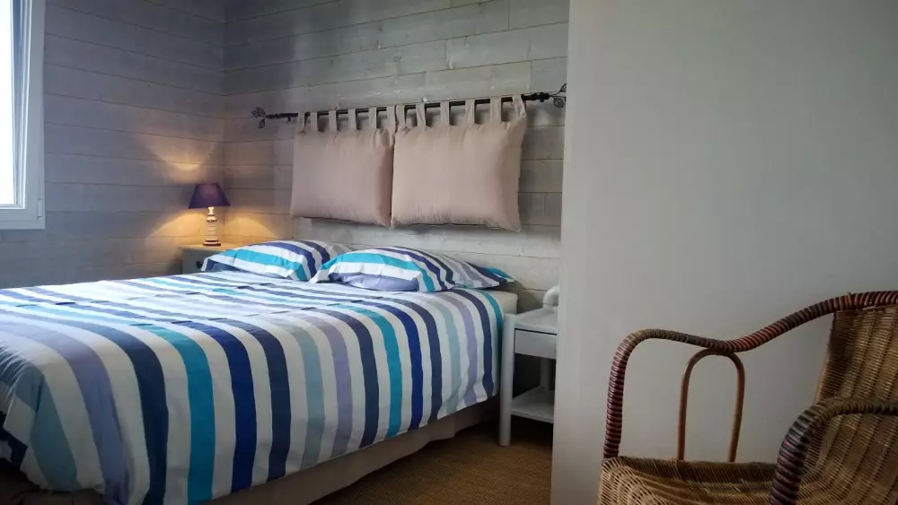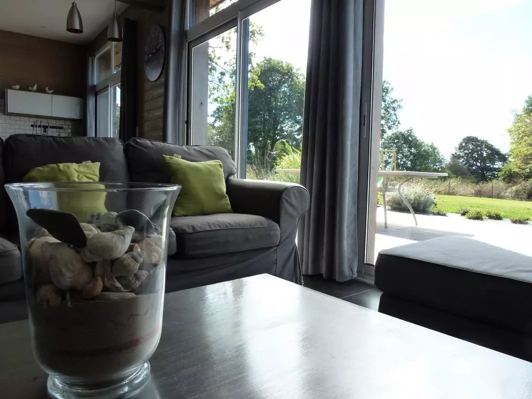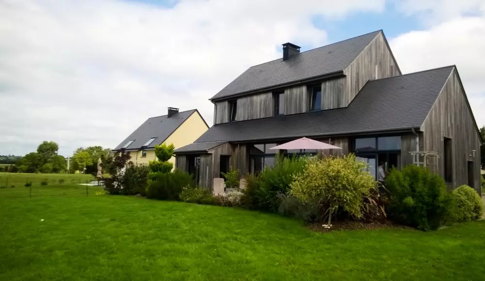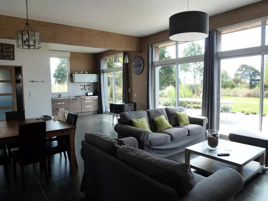 Maison indépendante. RDC :séjour. Coin cuisine. Buanderie. Chambre 1 (1 lit 140) avec salle d'eau privative. WC. Etage : Ch2 (1 lit 140) Ch3 (1 lit 140). Ch4 (3 lits 90), lit bébé. Chaise bébé. Salle d'eau. WC. TV. Lecteur DVD. Téléphone. Internet Wifi. Lave-linge. Lave-vaisselle. Congélateur. Chauffage par poêle à granulés (fournis). Linge de toilette en location. Draps en location (lits faits). Service ménage en supplément. Terrain clos privé. Terrasse bois. Salon de jardin. Barbecue. Portique. Cette maison ossature bois à l'esprit très contemporain est remarquable par ses volumes et sa luminosité. Une prestation de grande qualité qui offre un superbe panorama sur la Baie du Mont Saint-Michel jusqu'à Cancale! Les couchers de soleil sur la mer sont inoubliables.