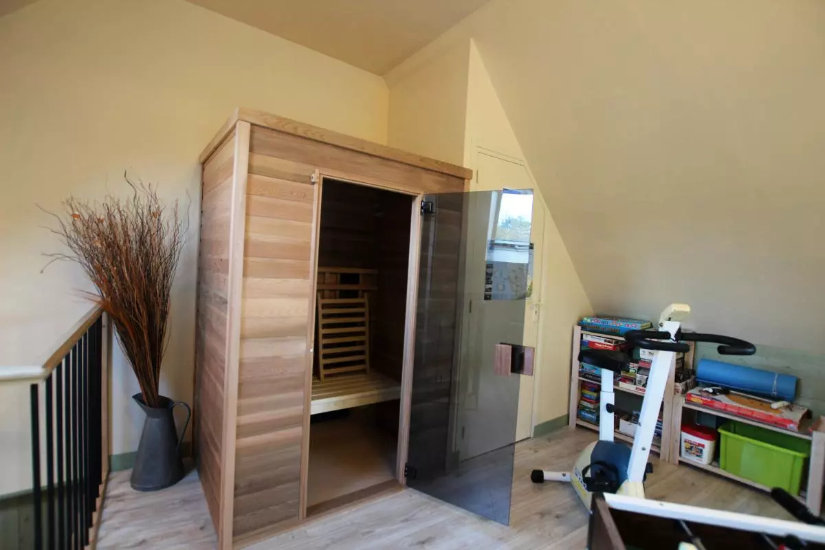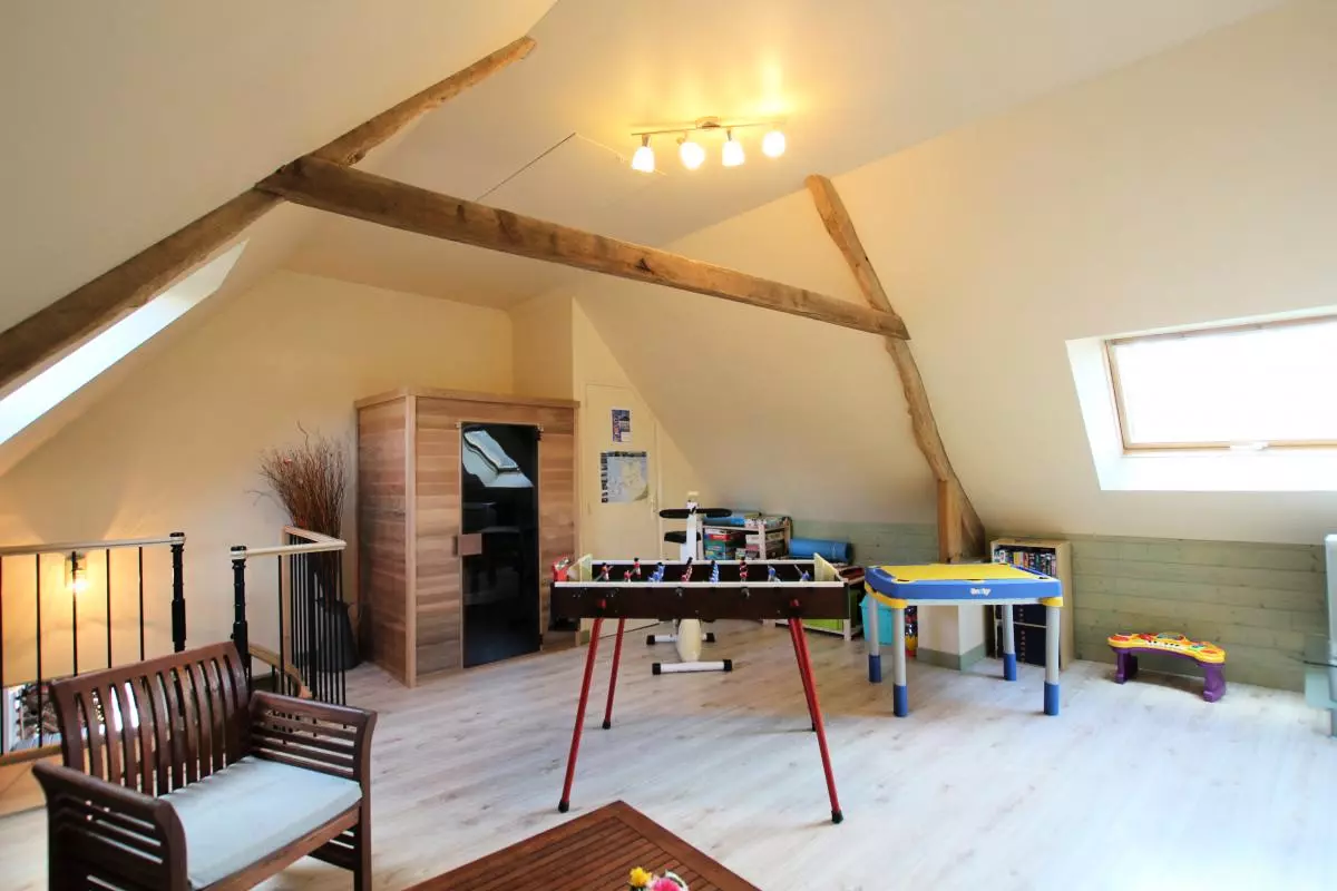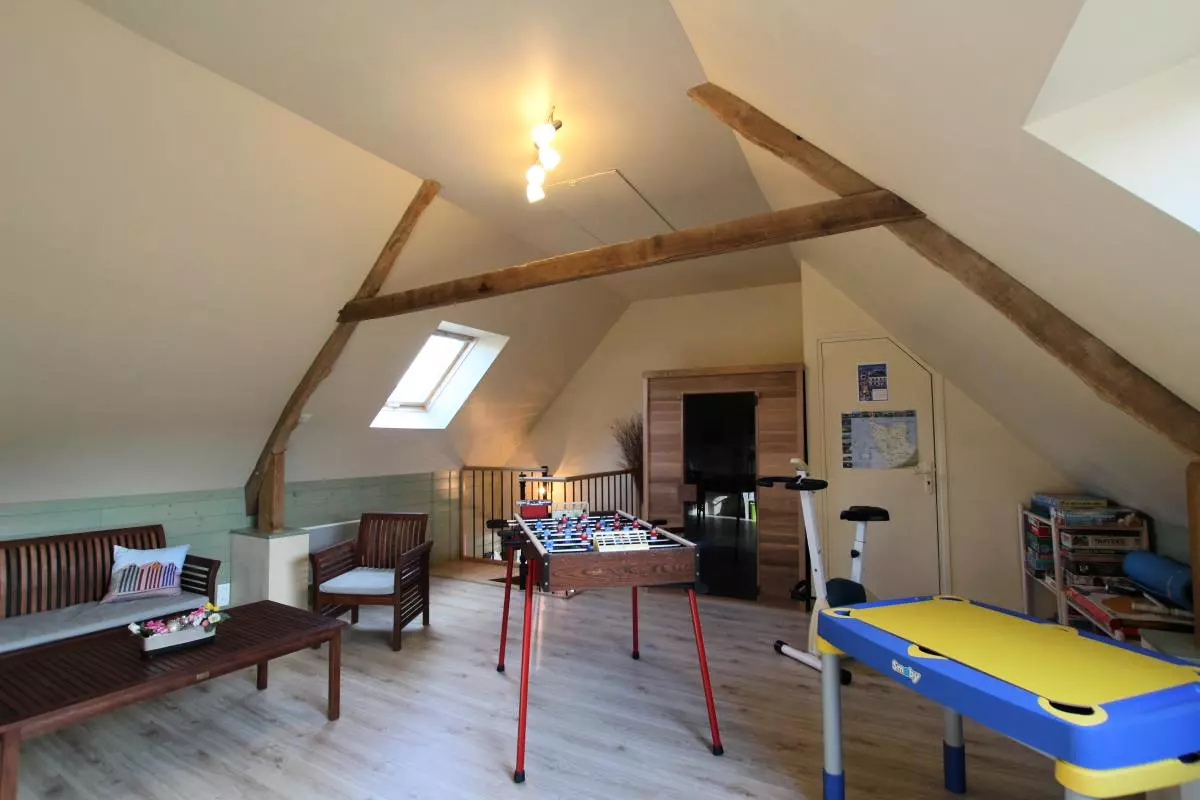Maison indépendante entièrement en rez de chaussée. Séjour coin cuisine. 2 chambres . 1 lit 140. 2 lits 90. Salle d'eau. wc. TV. Lecteur DVD. Lave linge. Sèche-linge. Lave vaisselle. Chauffage électrique en supp. Draps fournis. Linge de maison en location. Service ménage en supp. Salle de jeux. Vélo d'appart. Sauna (20?/ semaine). Terrain clos commun. Salon de jardin. Barbecue. portique. Abri.Gîte bienvenue bébé. A seulement 1.5km de la côte, ce hameau tout en pierre niché en fond de vallon offre un environnement idéal pour la marche à pied! C'est d'ailleurs la grande passion de la propriétaire qui pourra vous distiller de nombreux conseils. Vaste espace vert à disposition. Wifi seulement sur la terrasse. Salle de détente au dessus du gîte (babyfoot, DVD, bibliothèque, home trainer)
