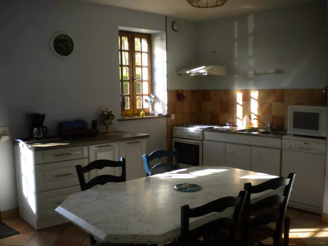 Maison indépendante. Séjour. Cuisine. Chambre 1 (1 lit 140) Ch2 (2 lits 90) Ch3 (2 lits 90) Ch4 (2 lits 90) Ch5 (2 lits 90). Salle de bains. 2 salles d'eau. 3 wc. Cheminée. Prise TV. Tél. Téléséjour. Lave-linge. Lave-vaisselle. Draps et linge de maison non fournis. Service ménage en supp. Chauffage électrique en supp. Terrain non clos privé. Salon de jardin. Barbecue. Portique. Abri. Parking. Gîte à proximité d'un bois bordé d'un ruisseau. Vacances au rythme des saisons: cueillir les jonquilles ou griller les châtaignes dans la cheminée... Les enfants vivront leurs aventures dans cette nature à leur disposition.
