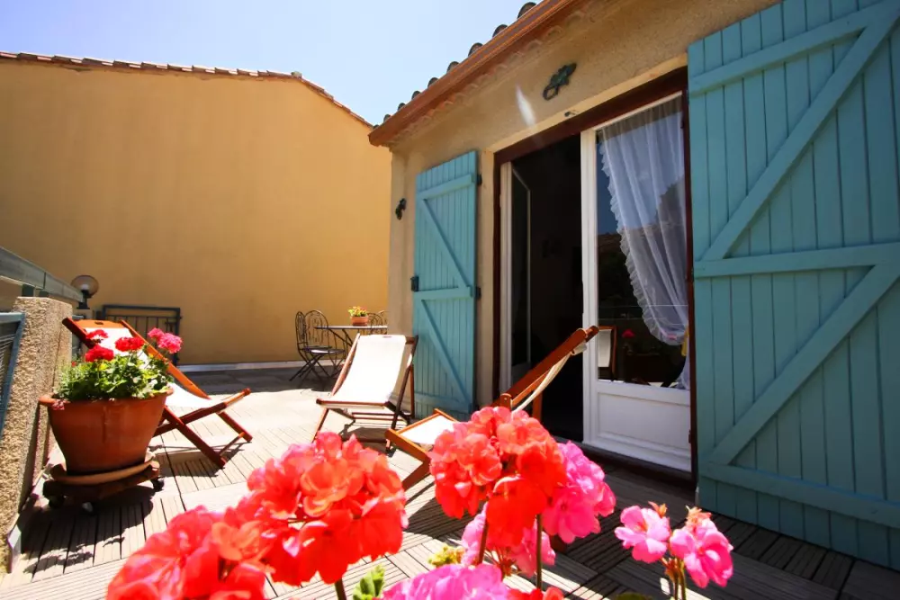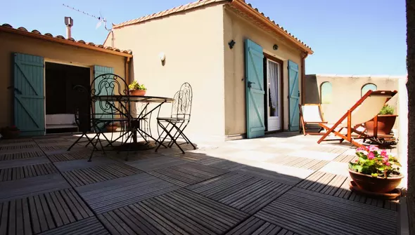 Séjour-cuisine bar (four Micro ondes, lave Vaisselle,bibliothèque, lecteur CD). 3 chambres dont une donnant sur la terrasse (2 lits 2 pers. - 2 lits 1 pers.). Salle d'eau. WC ind. Chauffage électrique en sus. 4 vélos adultes et 1 VTT. Gîte dans un village des Corbières, situé à l'étage d'une remise ou se trouve le barbecue (possibilité de rangement vélos), accéssible par un escalier extérieur. Grande terrasse de 35m² avec salon de jardin. Le village est au coeur du vignobles des Corbières, sur la route des sites du Pays Cathare, à 20 kms des plages. A la belle saison vous profiterez des légumes du jardin de la propriétaire.