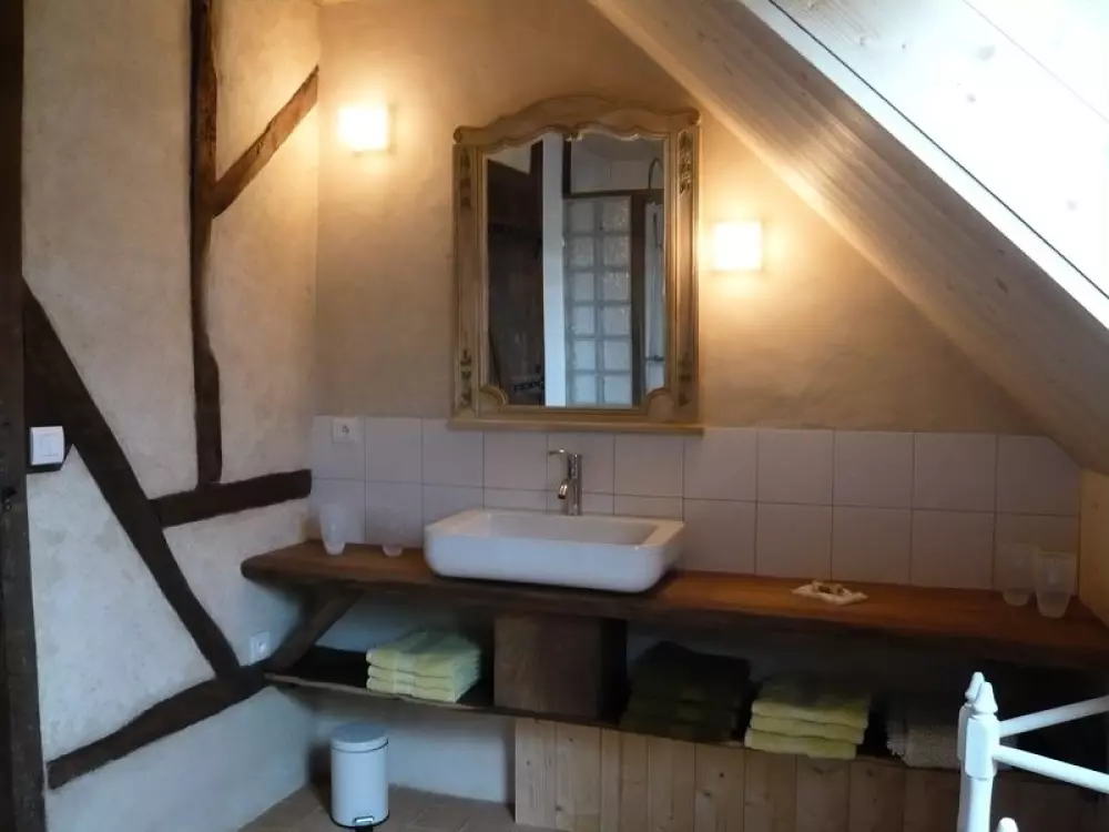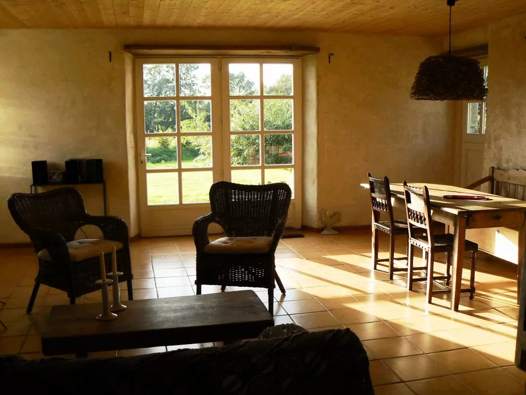 Maison indépendante. Séjour. Coin-cuisine. Chaine-HIFI. Lave-linge. Lave-vaisselle. Chambre 1 (1 lit 160). Chambre 2 (2 lits 90). 1 lit et 1 chaise bébé. Salle d'eau. 2 wc. Draps et linge de maison fournis. Lits faits à l'arrivée. Service ménage. Chauffage par poêle à granulés. Toutes charges comprises. Terrain privé non clos. Terrasse. Barbecue. Salon de jardin. Cellier. Vous succomberez comme nous au charme de cet ancien pressoir immergé dans un petit paradis végétal! Les propriétaires ne sont pas étrangers à cette opération séduction: passionnés de jardin et très respectueux de l'environnement, ils sauront vous faire partager leurs convictions et leur amour de la nature! Qualifié Ecogîte et Gîte au jardin, ce gîte est en effet remarquable dans sa conception, notamment par son intégration au paysage, la valorisation de nombreux matériaux de récupération, la gestion de l'eau, l'énergie solaire...