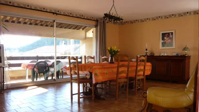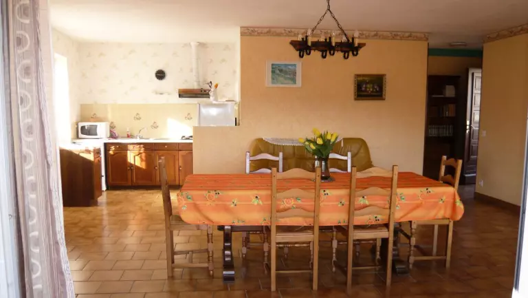 Séjour-cuisine(frigo-congélateur, L Vaisselle, four Micro Ondes) avec un canapé. 2 chambres (1 lit 2 pers.-2 lits 1 pers-1 lit BB). Salle de bains-wc. Chauffage électrique en sus. Taxe de séjour 0.50E/j/adulte. Situé à l'étage d'un ancien bâtiment agricole, accessible par un escalier extérieur, le gîte est situé aux abords du village avec loggia de 15 m2. un salon de jardin, barbecue et un terrain non clos en bas.