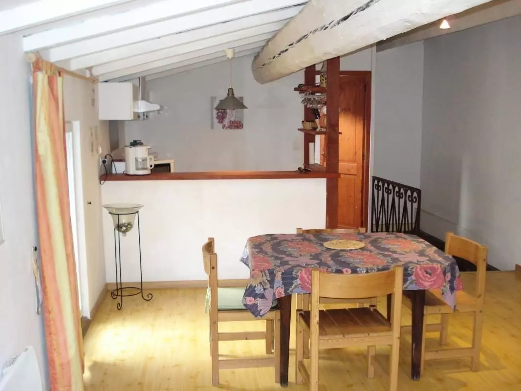 Au RDC: hall d'entrée avec wc et escalier accédant à l'étage sur une pièce mansardée avec séjour (TV) avec cuisine bar. Coin nuit bien séparé (1 lit 2 personnes -1 couchage 1 personne). Salle d'eau. Chauffage électrique en sus. Lave-linge. Petit gîte de type studio au coeur d'un village typique des Corbières, entouré de garrigues et de vignes, à 7 km des plages de Leucate, la Franqui, et Port-la-Nouvelle. Boucles de randonnée sur place.