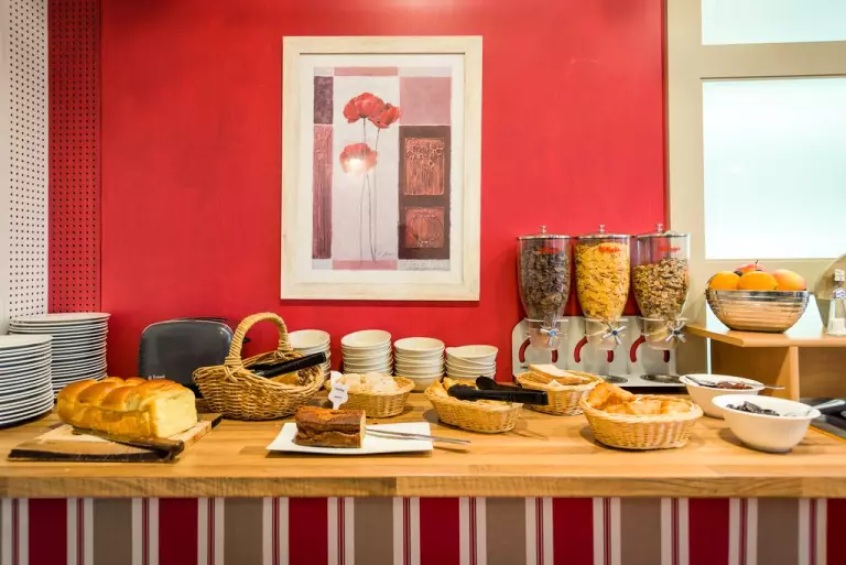 - Petit-déjeuner en buffet avec large choix de mets sucrés et salés (lait végétal et pain de mie sans gluten à disposition)