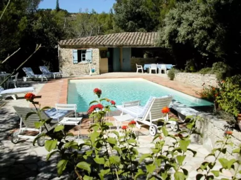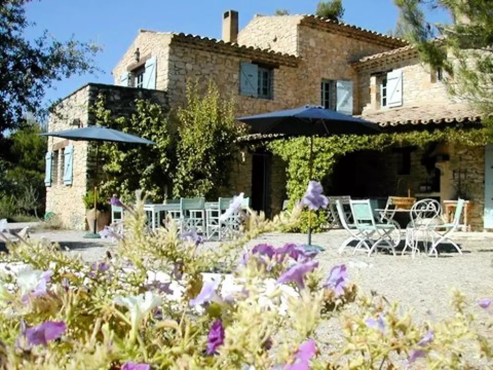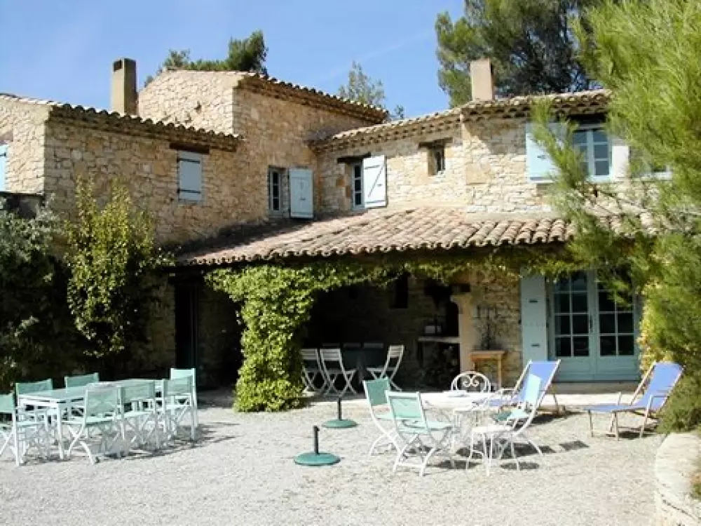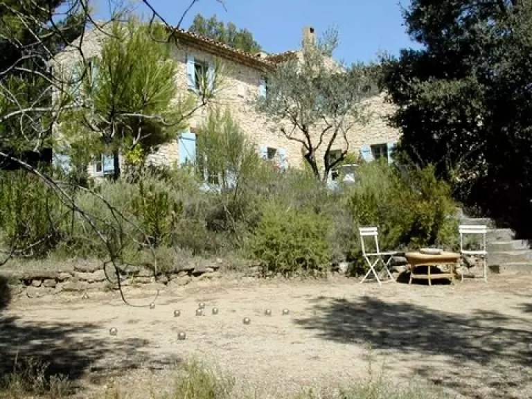 Superbe Mas de charme en pierres apparentes, restauration de qualité, perché à flanc de colline au milieu d'un hectare de terrain arboré de pins, chênes, et entouré de vignes. Vue panoramique imprenable sur la campagne environnante et le Mont Ventoux.
