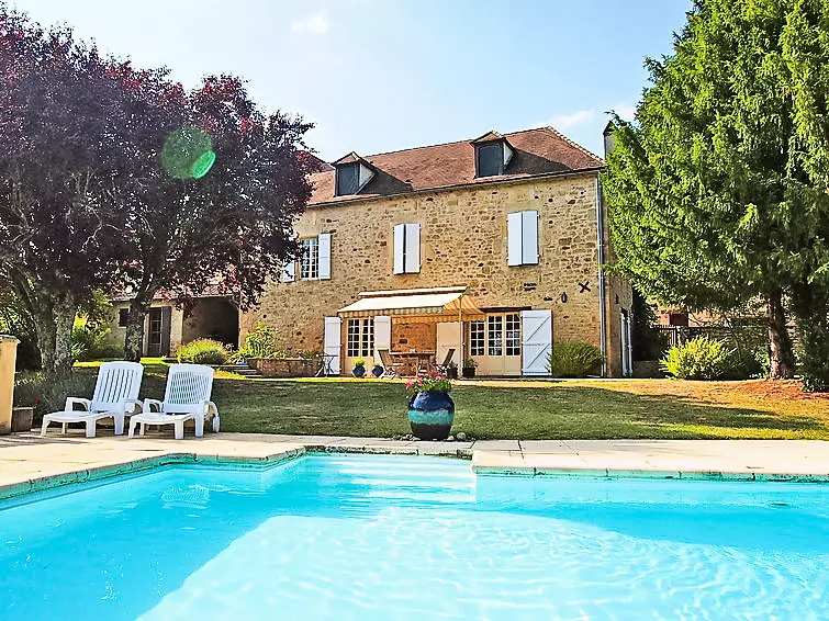 Cenac Saint Julien à 5 km de Domme: Grande maison de campagne rustique "La Bouffardine", de 3 étages, année de construction 1850, rénovée en 2000, environnée par les arbres, prés et champs. En bordure de la localité, à 4 km du centre de Cenac Saint julien, situation tranquille, à 100 m de la forêt, à 4 km de la rivière, au pied Vallée du Riol, dans la verdure. A usage privé: terrain 1 ha, grand jardin 1'300 m2 avec pelouse et plantes, piscine (10 x 6 m, profondeur 80 - 250 cm, 01.05.-28.10.). Place de parking (pour 2 voitures) près de la maison. Magasins 4 km, magasin d'alimentation 4 km, supermarché 4 km, restaurant 4 km, bar 4 km, café 4 km. Tennis 4 km, centre équestre 15 km. Attractions à proximité: La Dordogne 4 km, les 2 Golfs de Siorac 18 km. Région de randonnées: la Vallée de la Dordogne. Veuillez noter: voiture recommandée. Bien convenant à 6 adultes + 2 enfants.