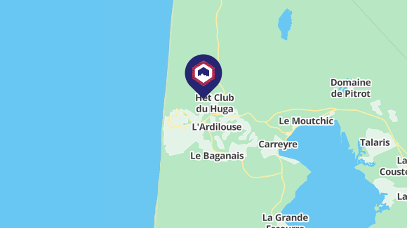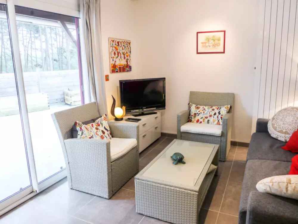 Résidence "Les Palombes". En bordure de la localité, à 2 km du centre, à 2 km de la mer, à 2 km de la plage, dans la forêt. En commun: piscine (12 x 8 m, profondeur 100 - 180 cm, disponibilité saisonnière: 15.Jun. - 15.Sep.). Magasins 2 km, supermarché 2 km, arrêt de bus "Marie Curie" 850 m. Terrain de golf (18 trous) 3 km, tennis 1 km, centre équestre 15 km.