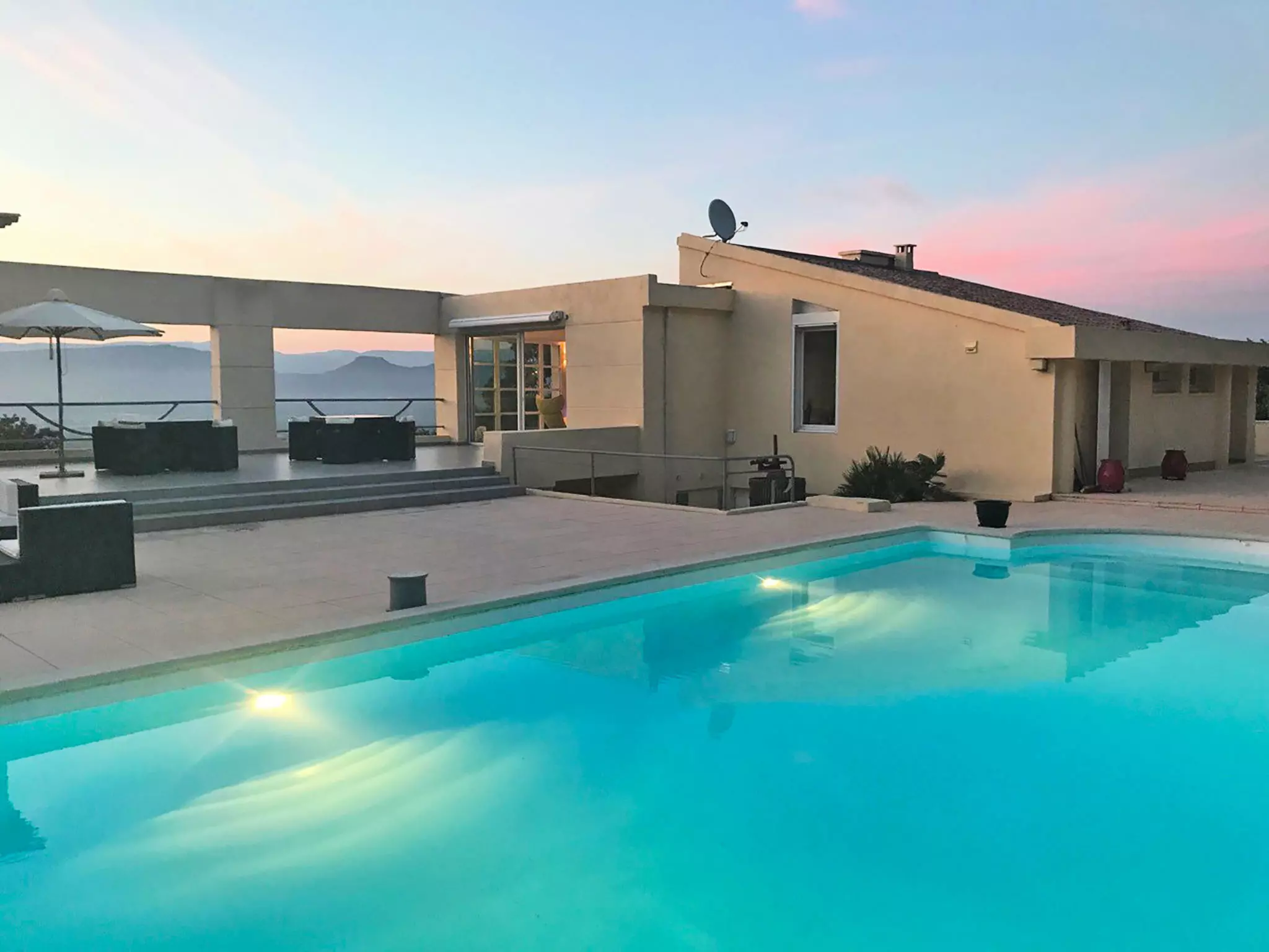Maison individuelle moderne "Les Toscanes", de 2 étages, environnée par les arbres. Location composée d'un bâtiment principal et d'une annexe en-dehors de la localité Roquebrune sur Argens, situation tranquille, ensoleillée, surélevée sur une colline, dans un quartier résidentiel, zone avec peu de trafic, dans la verdure. A usage privé: jardin naturel 1 ha (clôturé), piscine rectangulaire, chauffée, à l'abri des regards (12 x 6 m, profondeur 60 - 170 cm, disponibilité saisonnière: 15.Mai. - 15.Oct.) avec protection par couverture de volet et alarme de sécurité. Douche extérieure, pool house, terrasse (170 m2), barbecue. Infrastructures de la Maison: système d'alarme. Nettoyage 1 fois par semaine possible (en sus). Magasins 3 km, arrêt de bus "Roquebrune Village" 2 km, gare ferroviaire "Fréjus" 20 km, plage de sable "Plage de Saint Aygulf" 15 km plage de graviers "Calanque des Louvans" 14 km, parc "Areca" 14 km, centre thermal "Thalasso de Port Fréjus" 20 km, lac Lac de l'Arèna 3 km. Marina 15 km, terrain de golf (18 trous) 10 km, ecole de voile 15 km, centre équestre 7 km, centre sportif 4 km, chemins de randonnées pédestres depuis la maison 100 m. Attractions à proximité: Base Nature du Rocher 4 km, Roquebrune sur Argens 3 km, Saint Aygulf 15 km, Aqualand, Luna park 20 km, Sainte Maxime 24 km, Saint Tropez 40 km. Les domaines skiables de renommée sont facilement accessibles: Auron, Isola 2000 155 km. Les lacs connus sont facilement accessibles: Lac de St Cassien 50 km, Lac du Du Verdon 95 km. Région de randonnées: Col de Valdingarde 5 km, Estérel 25 km. Veuillez noter: voiture recommandée. Non recommandé pour des enfants en bas âge. Le propriétaire n'accepte pas les groupes de jeunes. Résidence avec portail électrique. Maison en 2 bâtiments (accès par l'extérieur). 5 chambres au total - 2 chambres et 1 salle de bain se trouvent dans l'annexe. Pour les séjours de 14 nuits et plus un ménage intermédiaire vous sera proposé par le propriétaire (en sus).