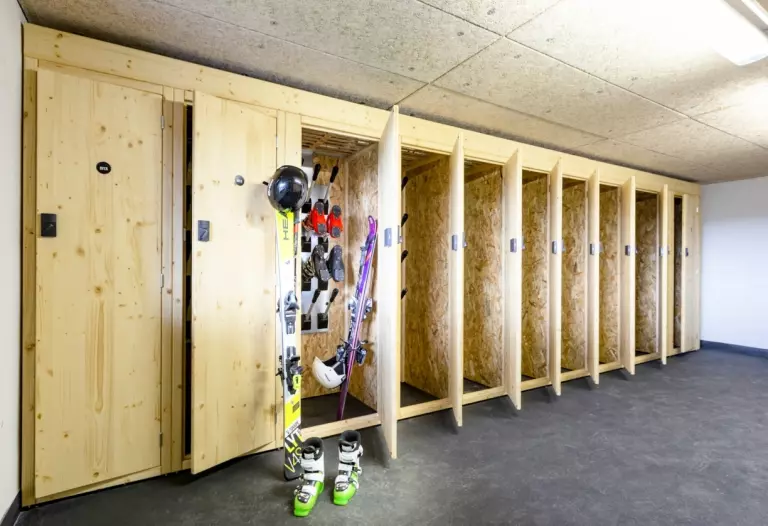 • Casiers à ski : dans la ski room avec sèche-chaussures dans chaque chalet