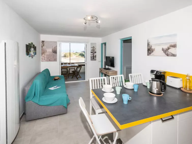 Petite résidence "Les Maisons de l'Océan", de 3 étages. À 500 m du centre, à 45 m de la mer, à 45 m de la plage. Place de parking ou garage pour voiture de petite - moyenne dimension. Magasins 500 m, supermarché 600 m, restaurant, boulangerie, location de bicyclettes 500 m, arrêt de bus "Salle l'Escoure Océan" 900 m. Terrain de golf (18 trous) 4 km, ecole de surf 100 m, tennis 2 km, centre équestre 15 km. Veuillez noter: D'autres appartements sont également proposés à la location dans cette maison de vacances.