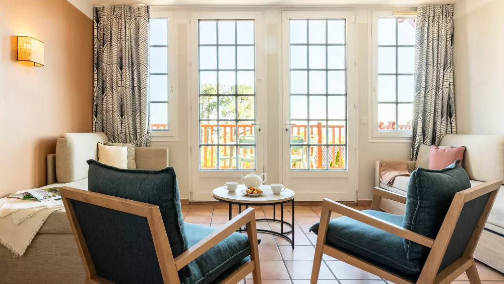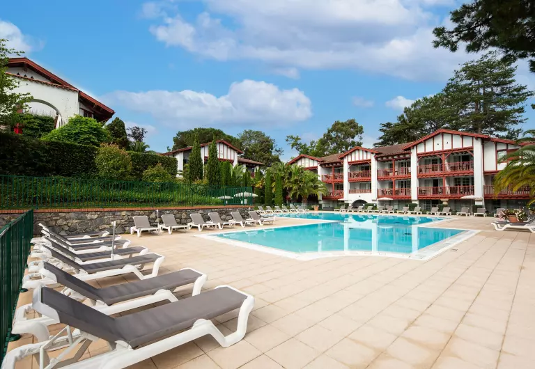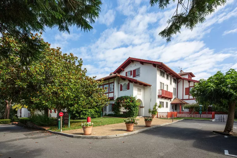 Elle arbore une architecture mêlant harmonieusement le style Belle Epoque et Basque avec ses colombages rouges et ses tuiles en terre cuite. Vous découvrirez des appartements modernes et cosy orienté sur le golf ou le jardin paysager.