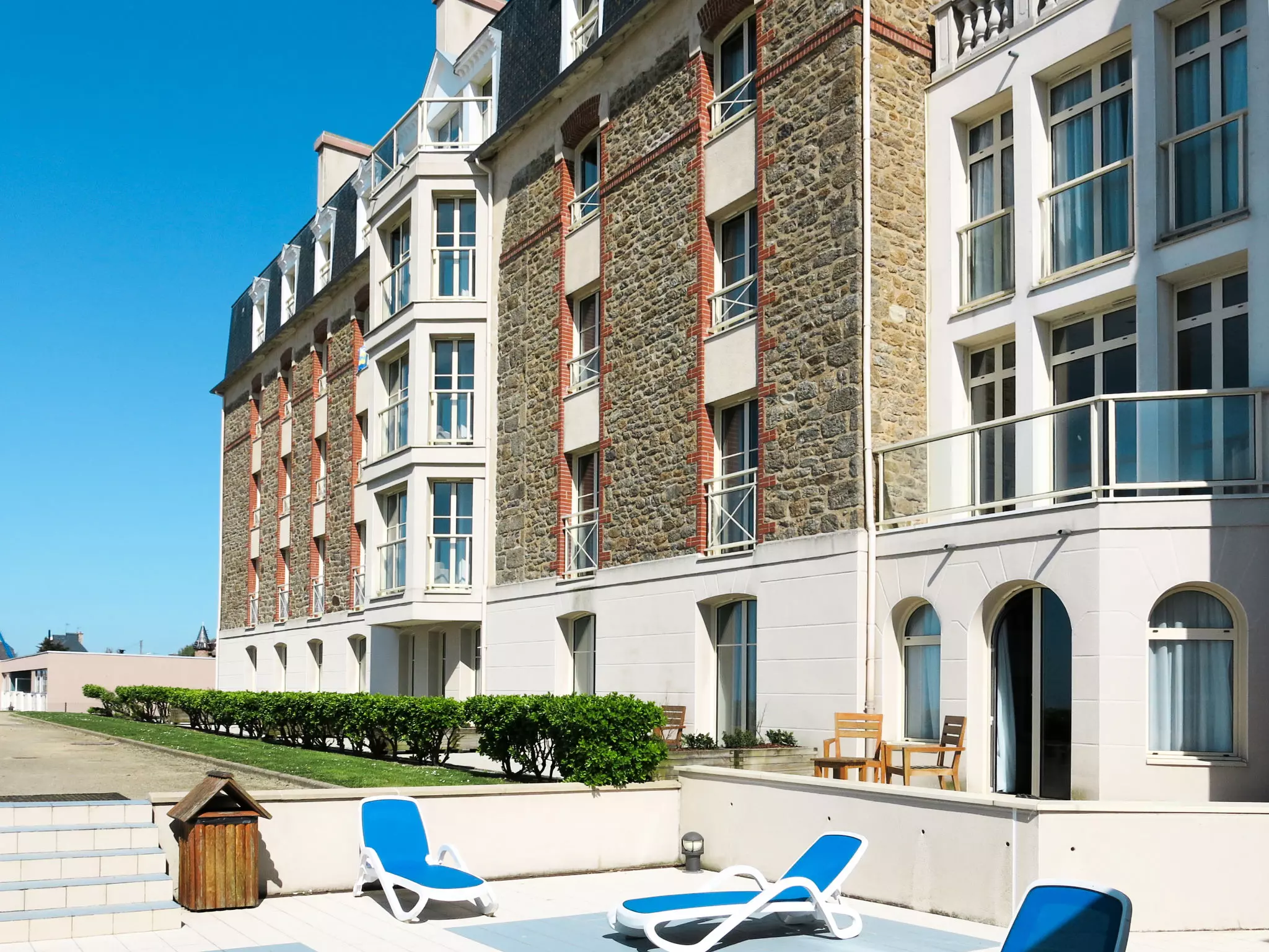 Belle résidence hôtelière "Reine Marine", de 4 étages. 67 appartements dans la résidence. À 3 km du centre de Saint Malo, à 30 m de la mer, accès direct à la plage. En commun: piscine couverte chauffée (13 x 8 m, disponibilité saisonnière: 01.Jan. - 31.Dec.). Terrasse. Infrastructures de la résidence: réception, bar, bains de vapeur (hammam), ascenseur, réduit pour bicyclettes, lave-linge, sèche-linge (en commun, en sus), location de bicyclettes. Service boulangerie. Place de parking. Borne de recharge électrique. Magasins 400 m, arrêt de bus 250 m, plage de sable "Plage de Minihic" 30 m. Ecole de voile 1 km, tennis 2 km. Attractions à proximité: Cancale 12 km, Dinard 13 km, Dinan 36 km, Mont Saint Michel 58 km, Rennes 70 km. Région de randonnées: GR34. Veuillez noter: La photo ne montre qu'un exemple de location de vacances.