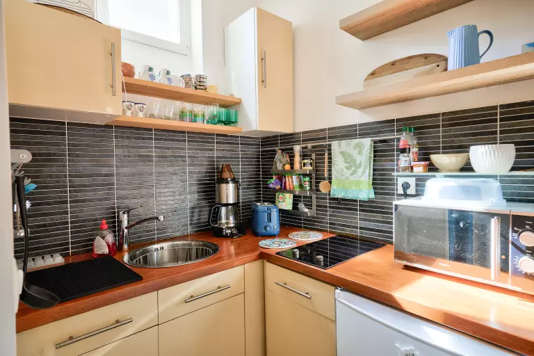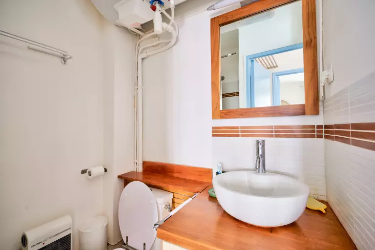 Très bel appartement en centre-ville de Trouville sur mer rénové avec goût disposant d'une séjour avec un très confortable canapé convertible, une cuisine américaine tout équipée, et d'une salle d'eau avec colonne à jet.