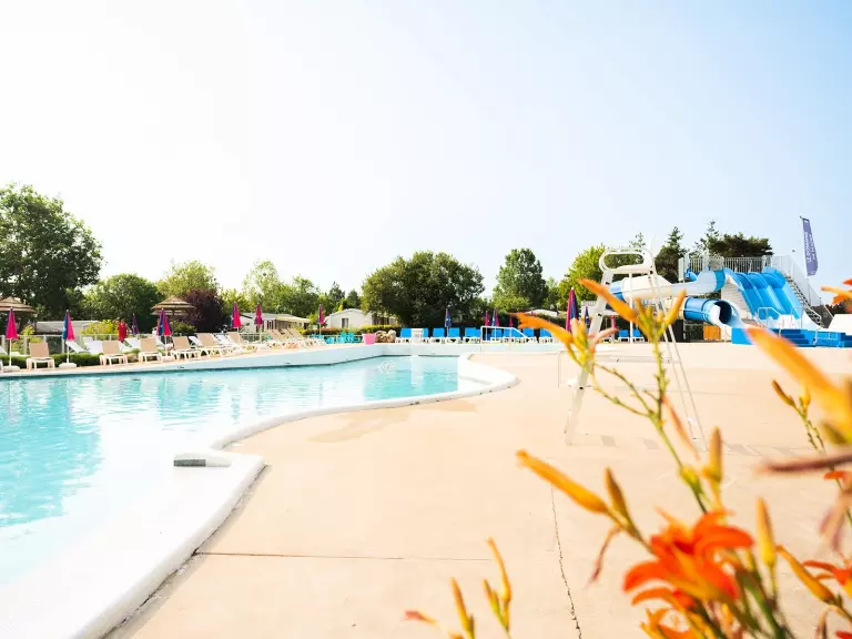 une grande piscine extérieure avec toboggan, surveillées par des surveillants de baignade qualifiés, pistes de glisse et rivière balnéo, une piscine recouvrable et chauffée, avec ouverture modulable