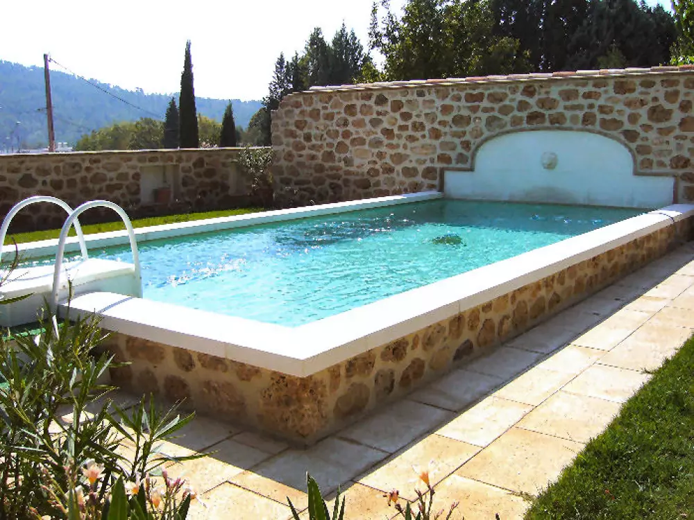 Piscine 9m x 4,5m – Profondeur de 1,50m – Fond plat – Echelle – Plages dallées et pelouse – Protection par alarme
