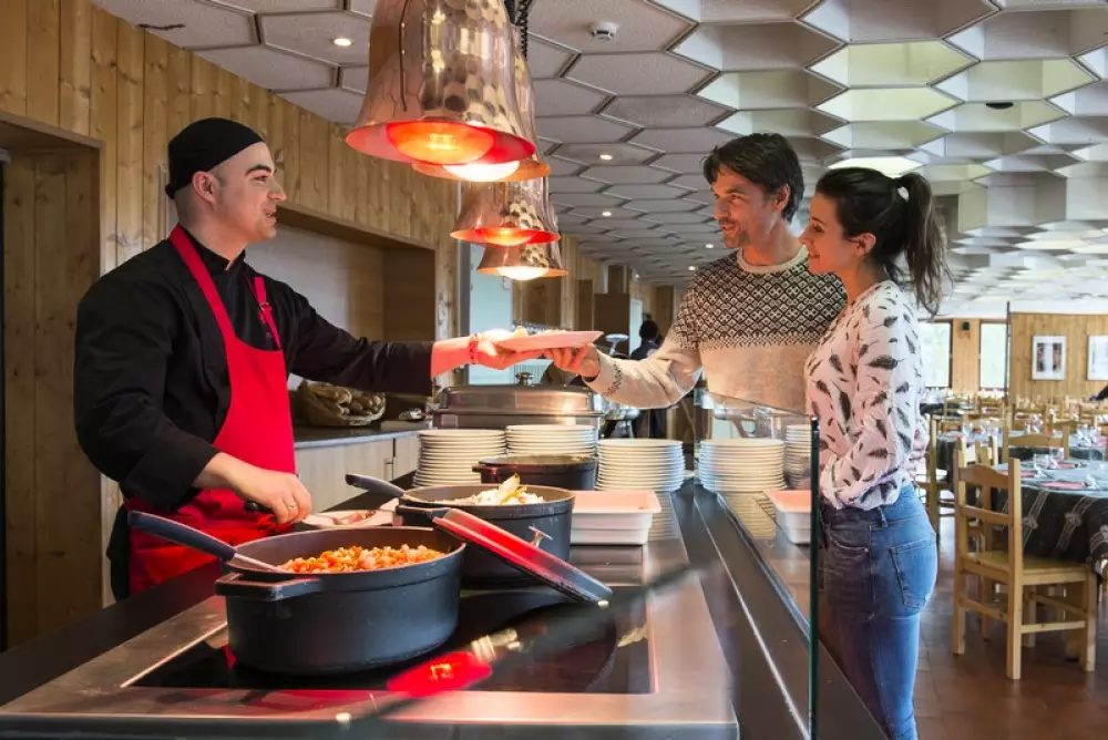 Petits déjeuners (7h30-9h30), déjeuners (12h-13h30) et dîners (18h45-20h30) servis en buffets variés avec entrées, plats chauds et desserts. Le restaurant typique est ouvert en soirée. Pour skier en toute liberté, possibilité de panier repas. Le restaurant met à votre disposition un micro-onde, des chaises hautes, des plateaux à l'effigie de Capinou et une vaisselle adaptée pour les jeunes enfants (ouverture à 18h45 pour permettre aux parents de faire dîner les jeunes enfants de bonne heure).